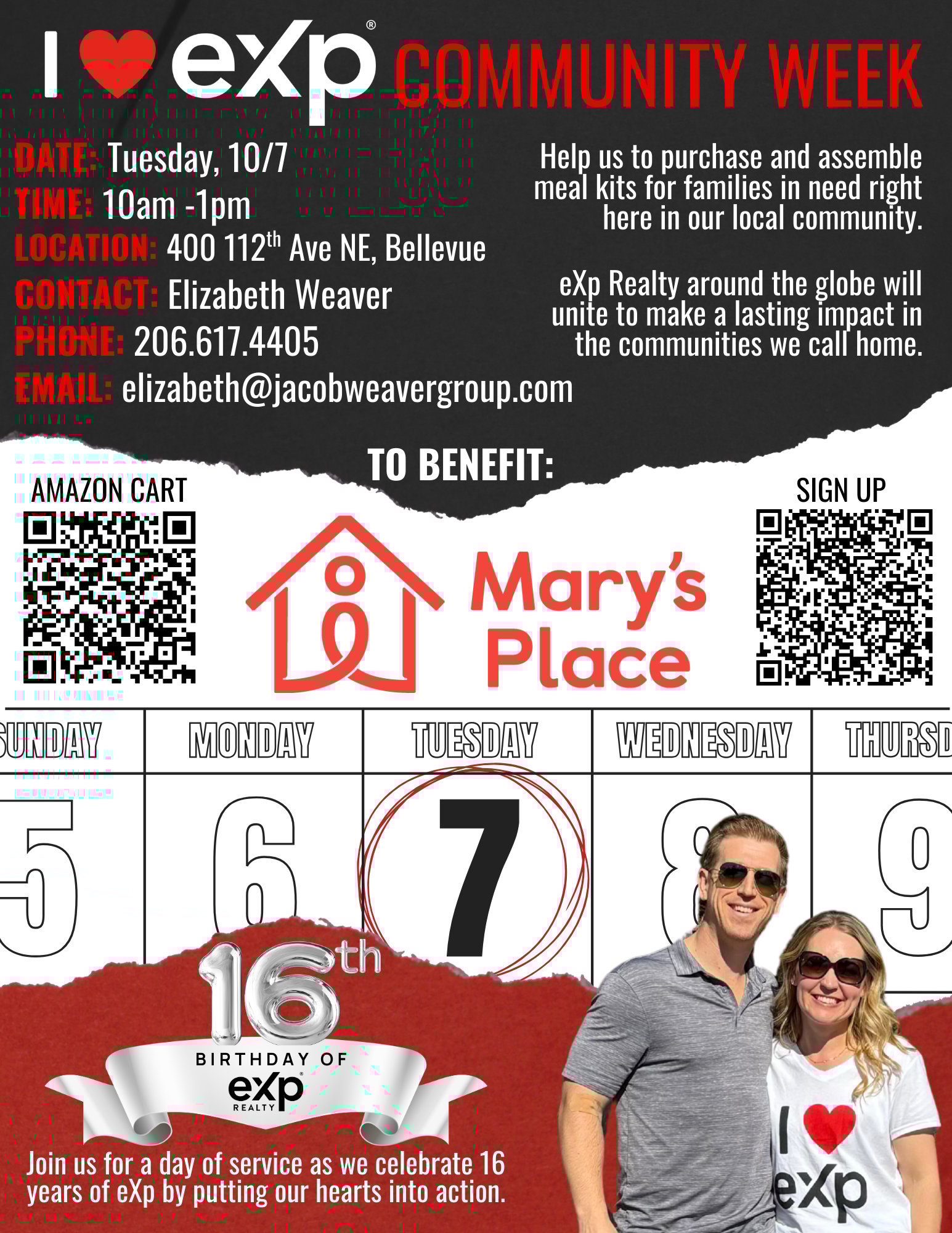 At Jacob Weaver Group, we believe real estate is more than homes—it’s about community. That’s why we’re excited to announce this year’s I Heart eXp Day, where we’ll partner with Mary’s Place to build 200 meal kits for families in need right here in Bellevue.